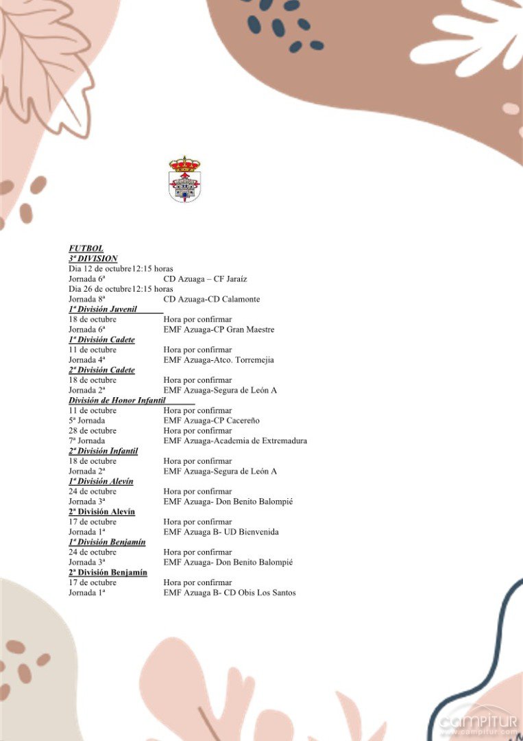 En la División de Honor Infantil, el conjunto azuagueño se medirá el 11 de octubre al CP Cacereño y el 28 de octubre a la Academia de Extremadura, mientras que los infantiles de 2ª División recibirán al Segura de León A el 18 de octubre.