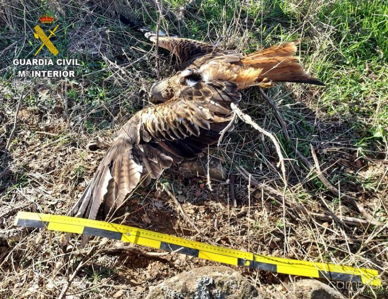 La Guardia Civil investiga a un vecino de la localidad pacense de Azuaga que usó unos plaguicidas muy tóxicos para matar ratas, provocando consecuentemente, la muerte de dos milanos reales tras cazar a los roedores.